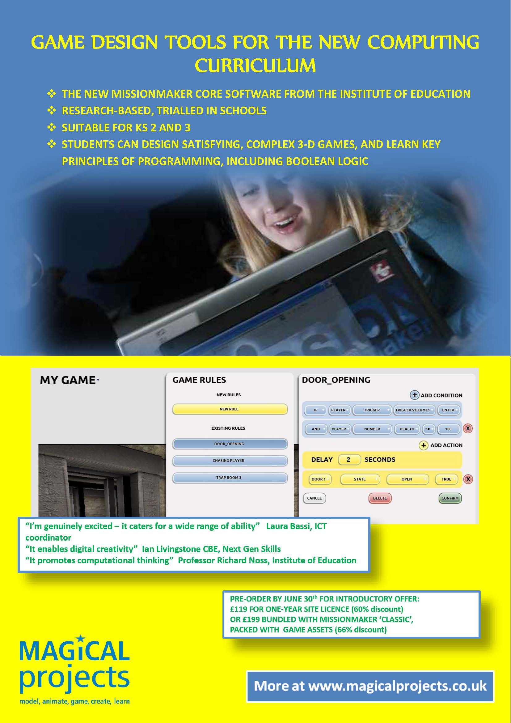 It has been developed in a research and development project by the UCL Institute of Education, in collaboration with schools. Building on the popular Missionmaker game-authoring tool, now owned by MAGiCAL projects at the IOE, it provides a groundbreaking new interface allowing pupils to make complex rules, learning key principles of programming and game design at the same time.