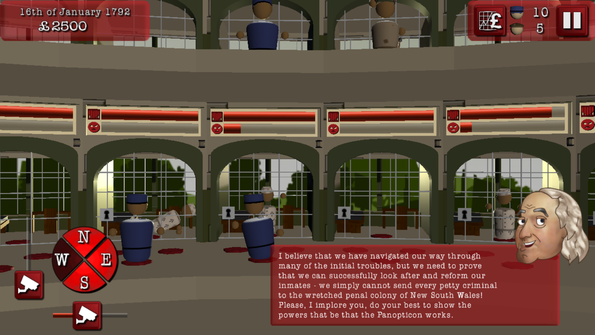 The failure of the panopticon scheme was a crushing blow and the greatest disappointment of Bentham’s life. No prison which adhered to Bentham’s design has ever been built, and Panopticon Pandemonium sees the construction—virtually—of a working panopticon for the first time. The player, assisted by Bentham himself, acts as governor of the prison and has to balance economies of the social benefits of Bentham’s vision—happiness, rehabilitation, work—against the functions of discipline, punishment, and surveillance, while also ensuring that their panopticon is orderly and profitable. These conflicting functions, rooted in Bentham’s writings, are realised as game mechanics with the player managing economies of work and nutrition, the recruitment and deployment of staff, coping with riotous prisoners, and ensuring that visiting dignitaries come away from the Panopticon with a favourable impression. Fail in the task and prisoners will instead be transported to New South Wales!