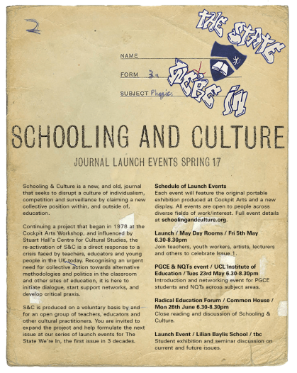 Schooling & Culture disrupts a culture of individualism, competition and surveillance by claiming a new collective position within, and outside of, the school context through self-representation and lived experience. This journal is an invitation to strengthen solidarity between teachers, students and cultural practitioners by exploring politicised praxes of secondary school teaching in the face of increasing conservative toxicity.