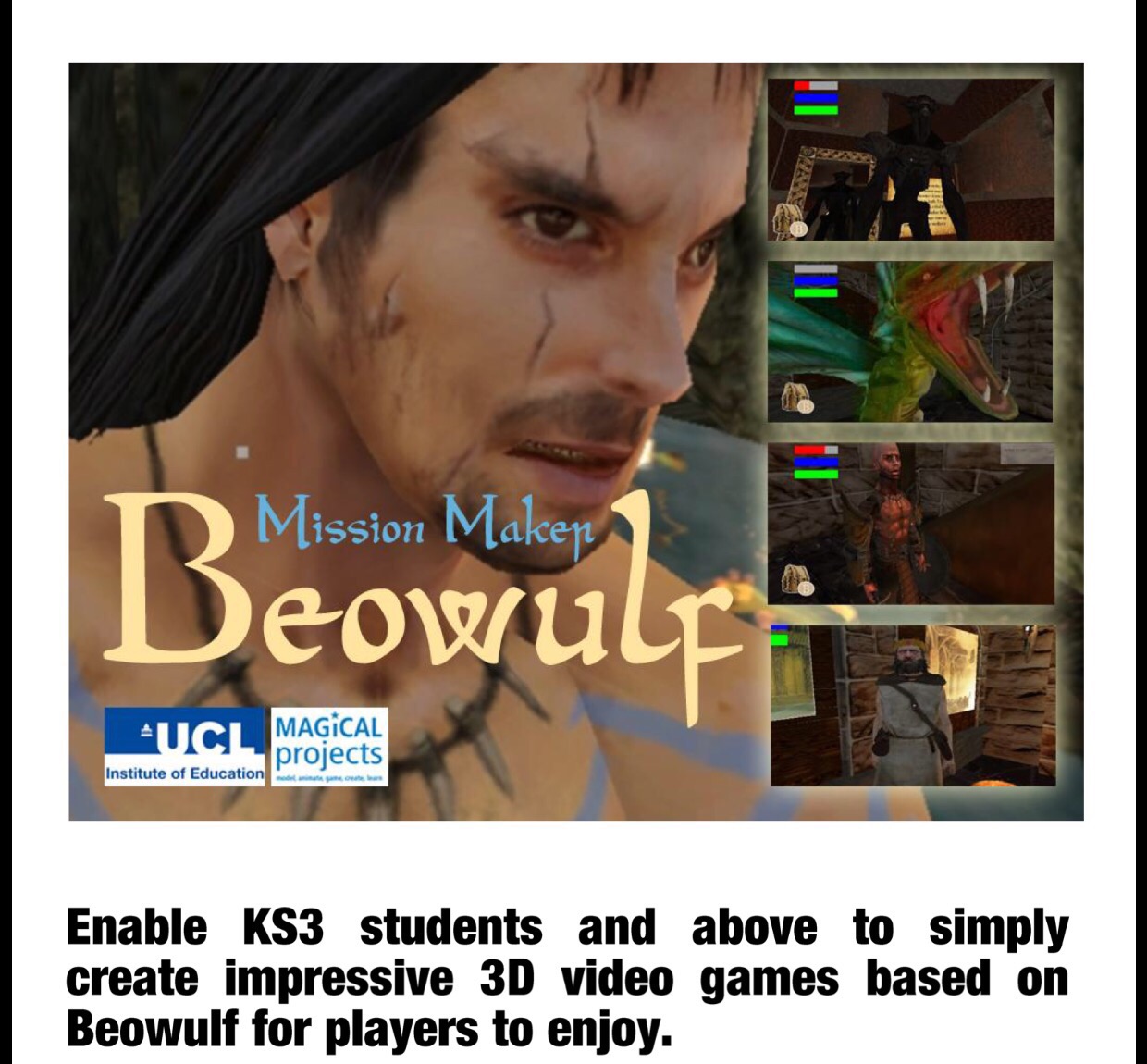 Playing Beowulf is a collaboration between UCL’s Department of English and Institute of Education, partnering with the British Library, the University of Sydney and Game City. The project is funded by the UK Arts and Humanities Research Council. The software, Missionmaker Beowulf, was developed during the project by MAGiCAL Projects and the DARE research centre.